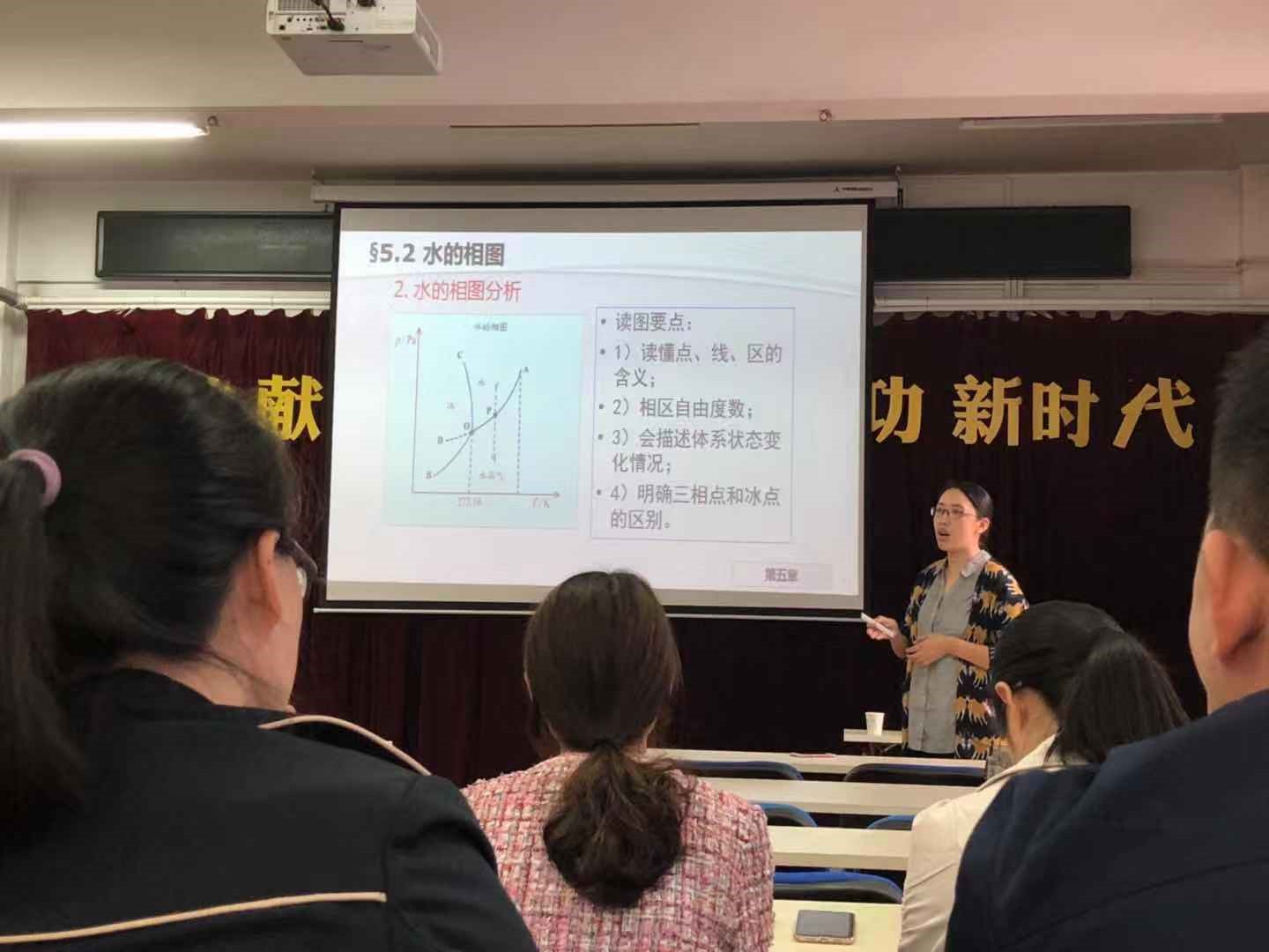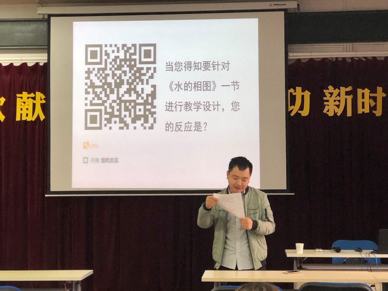 授课中间,何老师从各个方面告诉大家为何需要合适的教学设计。何老师提出教学目标主要分为三大块:知识目标,能力目标何情感目标。期间,更为详细的介绍了教学目标中所包含的细节内容。并对每个细节进行了充分的讲解,比如:重难点的确定,教学方法的选择等。在相关内容讲解中,何老师提倡启发式教学方法:由简单问题到复杂问题最后提问更为复杂的问题,一步一步提高对员工的要求,这样有利于加深员工对知识点的印象以及提高员工的积极能动性。何老师还提到,在相关的团队作战中,要明确分工,添加各种要求来提高员工的积极参与性。何老师还对教学过程进行了详细的讲解。最后,何老师利用自己对《水的相图》的课件给各位老师进行了示范举例并进行了知识的传递。