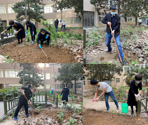 教研室和楼顶清扫结束后,大家又来到二号实验楼天井小花园。虽然大家这时很累,但是依然兴致很高。李长林书记与李其松、乔辉杰、王卓老师一起拿起铁锹,翻耕空地,掩埋枯草树叶,王丹丹、刘英、张瑞杰等老师则到处捡白色垃圾。通过大家的辛勤劳动,脏乱不堪二号实验楼天井小花园被打扫得一干二净。