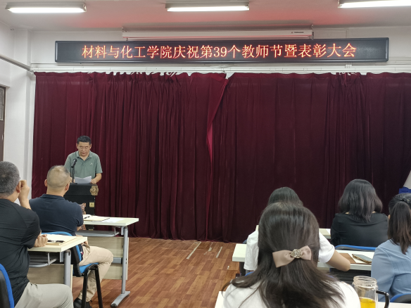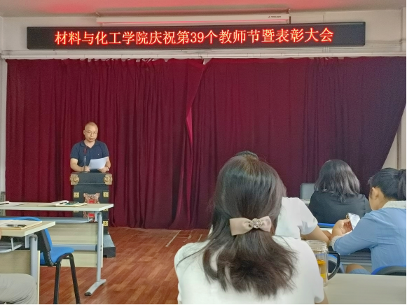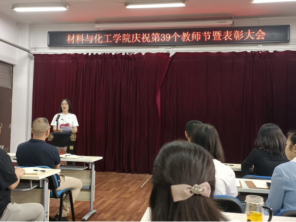 经理王方宣读了《材料与化工公司党委关于第39个教师节对做出贡献的先进集体和先进个人进行表彰的决定》,对2023年在师德师风、人才培养、科学研究、社会服务和管理服务等方面取得优异成绩的集体和个人进行表彰。