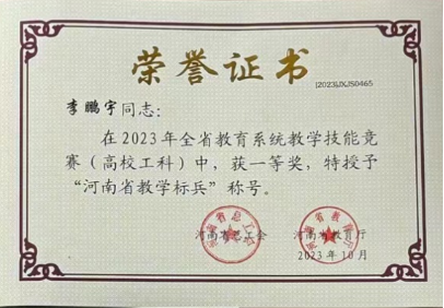 今年6月,根据河南省总工会、河南省教育厅《关于在全省教育系统开展2023年度教学技能竞赛活动的通知》文件精神,公司高度重视此次竞赛,秉承公开、公平、公正、择优的原则,认真组织选拔,推选出李鹏宇教师参加校内初赛,并最终推荐参加河南省教学技能竞赛。经过河南省竞赛评审委员会严格评审和现场总决赛,公司李鹏宇老师荣获高校工科一等奖,并被授予“河南省教学标兵”荣誉称号。