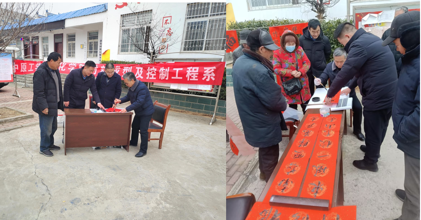 在公司扶贫地点方城县广阳镇新集村,樊平副教授和顾建兵博士一大早就在村委会门口摆摊挥毫,为86户贫困户书写春联一百多幅和福字,受到村民的热烈欢迎和赞扬。