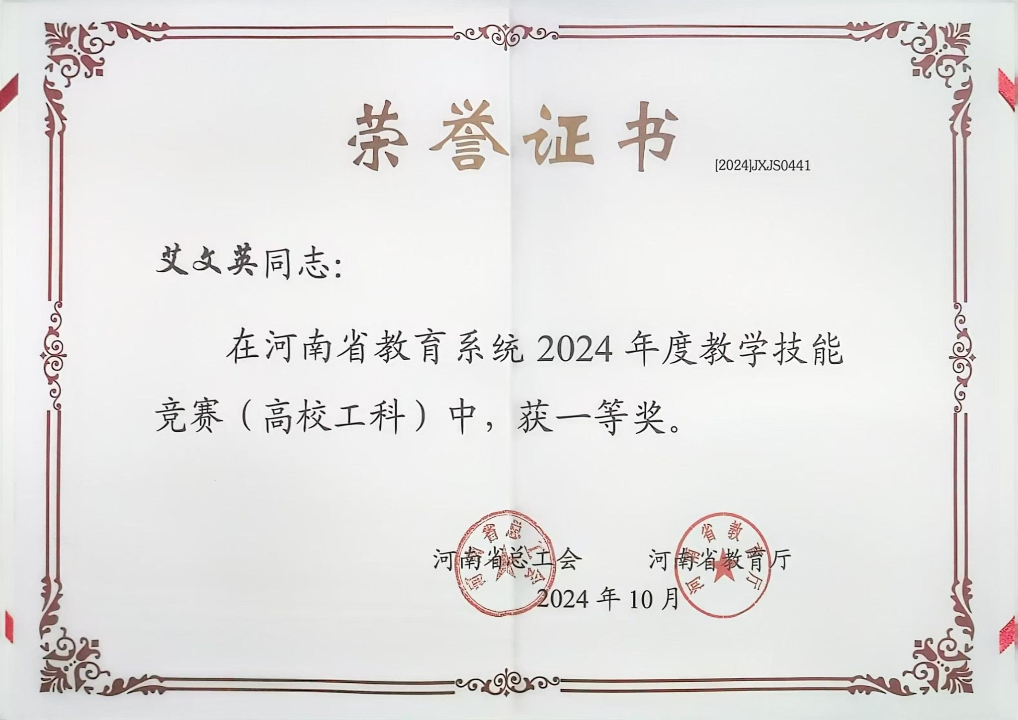 近日,河南省总工会、河南省教育厅联合下发《关于河南省教育系统2024年度教学技能竞赛获奖情况的通报》(豫工文〔2024〕89号),对获奖选手进行表彰,公司教师艾文英获一等奖。