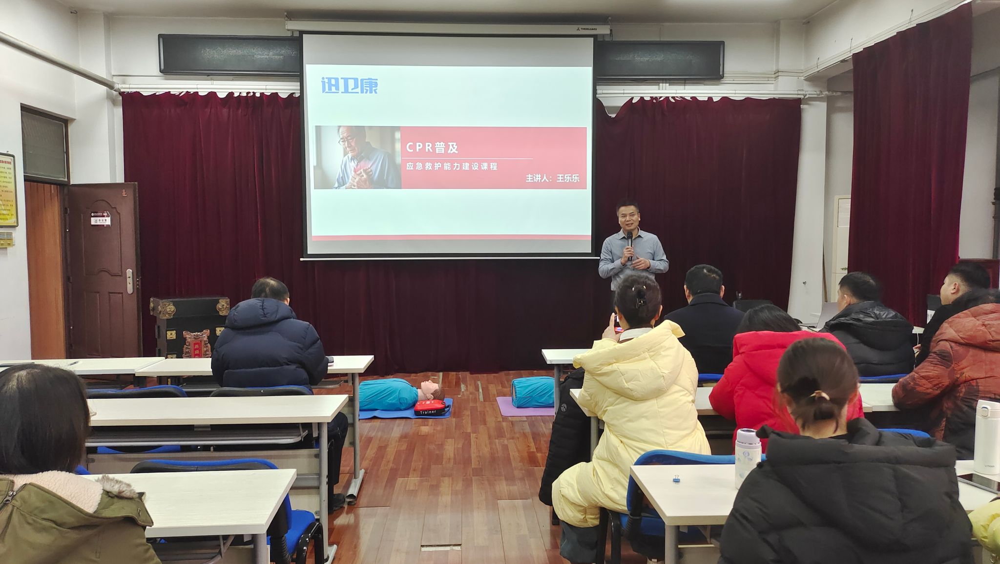 培训中,王乐乐聚焦校园应急救护核心需求,重点围绕心肺复苏操作流程、自动体外除颤器(AED)使用规范以及海姆立克急救法实操技巧三大模块展开。他结合真实应急案例,通过理论讲解、动作示范、要点拆解等方式,清晰阐释了各项急救技能的关键原理与操作细节,强调了“黄金急救时间”内规范施救的重要性,帮助教职工建立起科学的应急救护认知。