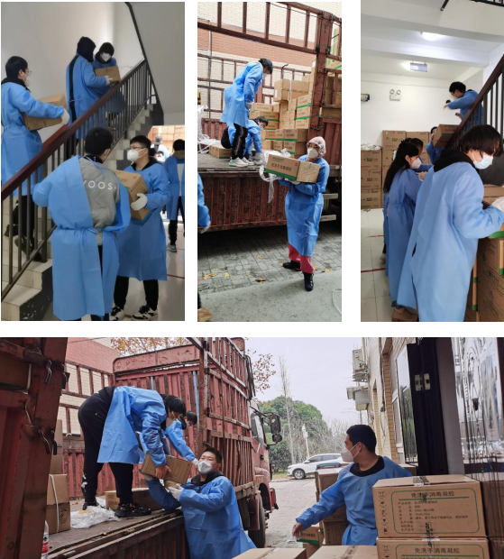 1123日,公司25名员工志愿者穿上隔离服、戴着N95口罩和手套,在后勤老师的指挥下有条不紊地卸载、搬运防疫物资。一件件、一趟趟,有力度,拼速度,量温度。一箱重30斤的消毒液,被794次举起,794次放下,23820斤的总重量,分配到每个人身上将近1000斤,你与我的不断接力,将满满一车的消毒液或扛、或抬,传递搬运到指定的物资存放处。