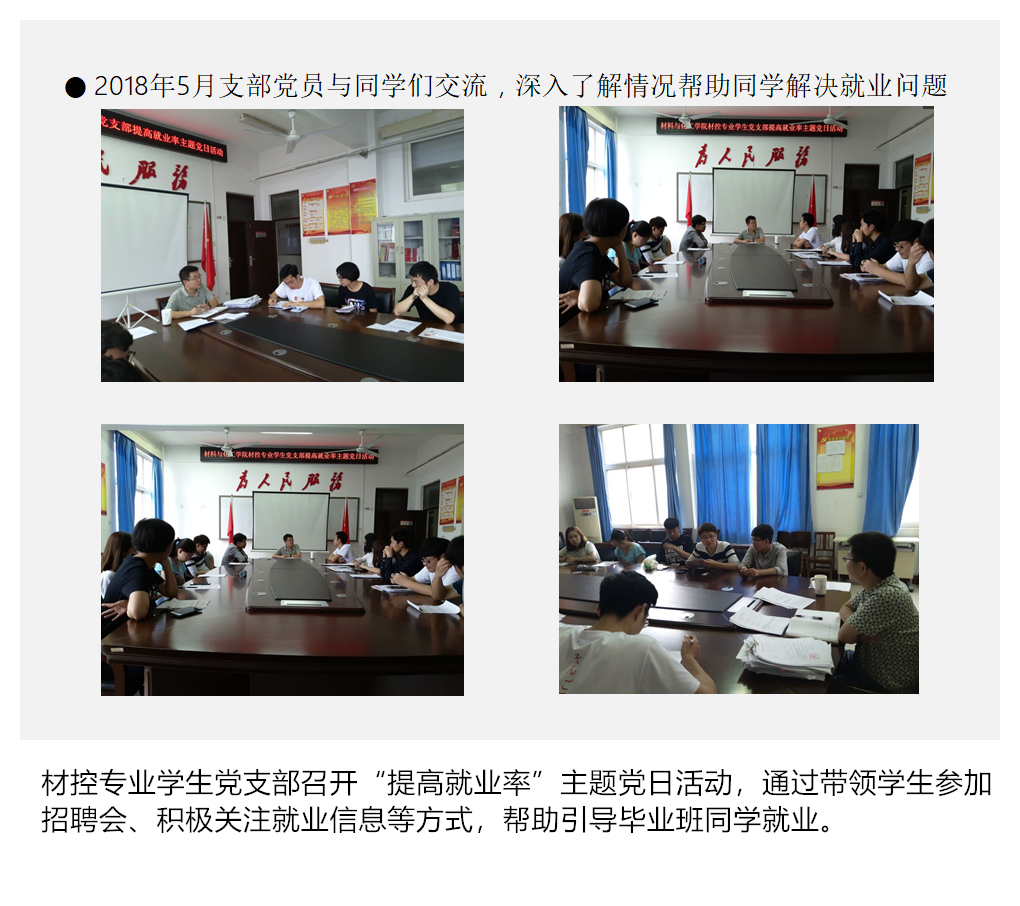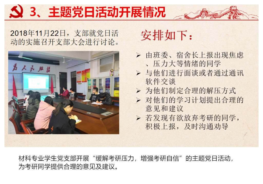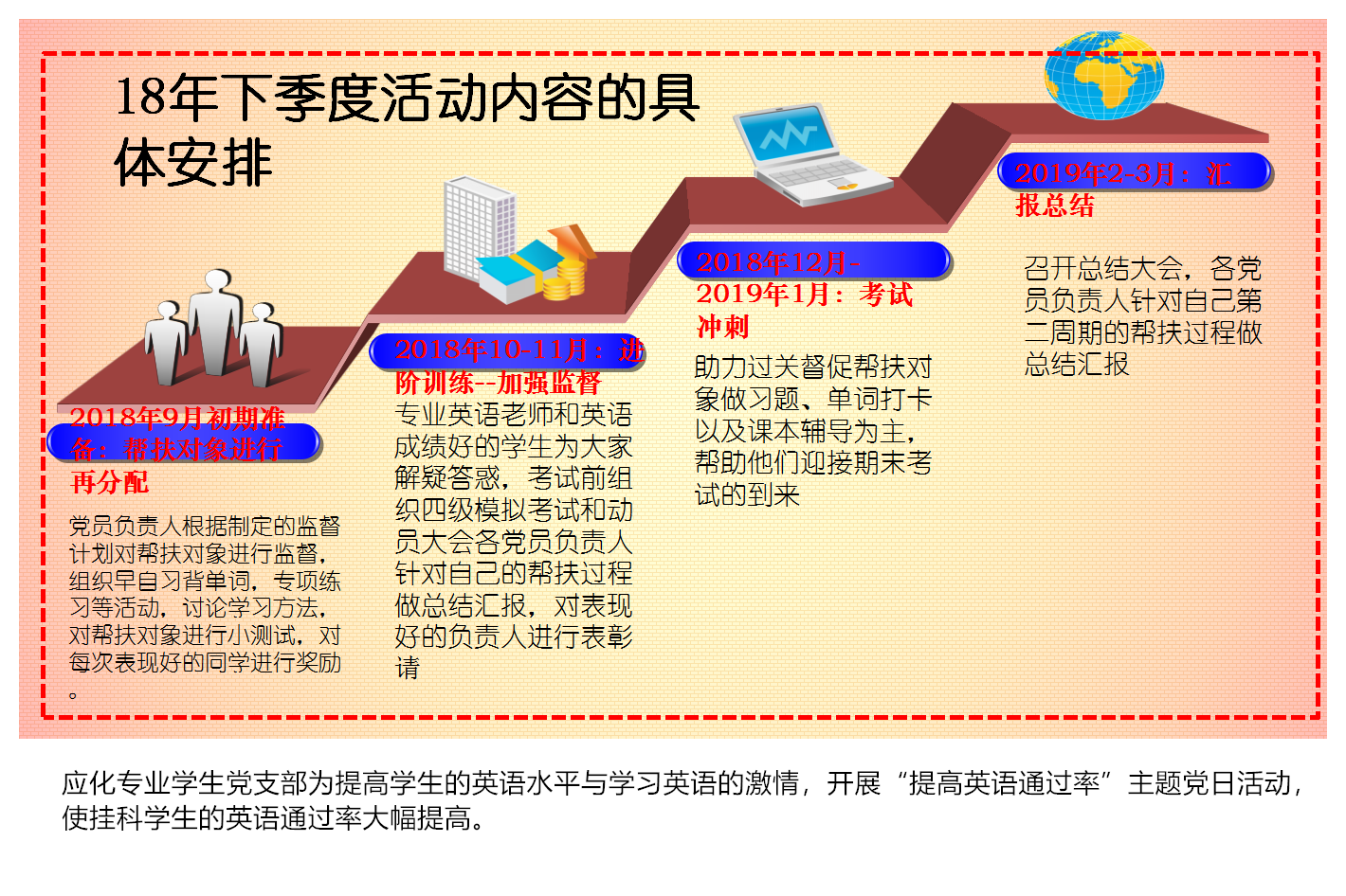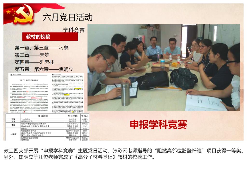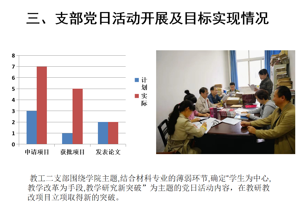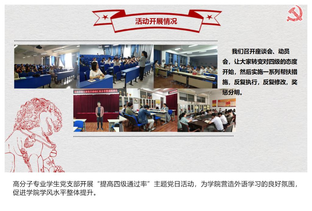教工一支部支部发挥专业优势制定了签订校企合作协议的目标,目前已签订协议11项,完成横向经费入账150万余元,超额完成了目标;教工四支部针对教学教研薄弱的情况,积极寻找突破口,计划撰写并出版教材1本、教研项目申请书2项、发表教改论文2篇,目前均超额完成任务,除此之外,焦明立、刁泉老师指导的创新团队获得2018年河南省“互联网+”老员工创新创业大赛一等奖并获得国赛铜奖,“高分子材料与工程”获批2018年db体育官网入口“专业综合改革试点”立项建设;以“以应用化学专业思政项目组”为载体,成立了教工七支部,创新了基层党组织建设,探索了“知识传授与价值引领同频共振”的有效路径。高分子专业员工党支部开展以“提高四级通过率”为主题的党日活动,通过对16级各班英语四级通过情况统计分析确定帮扶对象,帮扶前该班四级通过率为16.7%,帮扶后通过率达到40%,提升了一半以上。材科专业员工党支部开展以提高考研率为主题的党日活动,目标是研究生考取率达到30%,目前材科15级员工有74%参加了考研,过线率已经达到46.15%;研究生党支部针对员工科研成果少且质量不高的实际情况,制定了提升科研成果的活动计划,完成了25项学术成果,其中一区文章1篇,三区文章3篇,四区文章1篇,EI论文1篇,中文期刊4篇,专利14项,国家级竞赛奖1项。