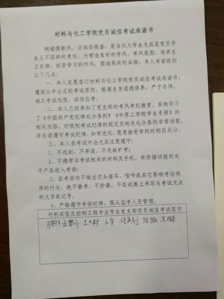 在教育大会上,党支部书记邢军阳要求全体党员、预备党员、入党积极分子要认识看待诚信考试,要在期末考试中发挥好先锋模范作用,当好排头兵、当好宣传队。邢军阳指出,全体党员、预备党员、积极分子要不断提高自己的党性修养,自觉抵制作弊抄袭等不良风气,带头遵守校规校纪,一方面以自己的良好形象影响带动身边同学拒绝舞弊、诚信考试,另一方面协助老师做好诚信考试的宣传教育,让更多人认识到违纪舞弊的危害,认识到诚信考试的重要,并向支部成员一一解读了公司对待考试舞弊行为的各种严厉处罚,会后支部全体成员在党员诚信考试承诺书上签了字。
