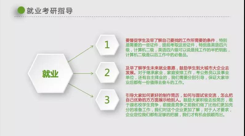 “要往山上走,顺问下山人”。当你我面临毕业就业时,班主任是“过来人”,他们的经验之谈对即将就业员工的用处可想而知。除了一些经验之谈,班主任指导员工进行职业生涯规划,树立科学的成才目标,有计划、有针对性地拓展综合职业能力,提升自身竞争力,做到“毕业即成才”。
