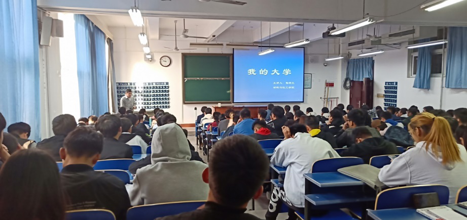 讲座中,焦明立老师通过PPT向大家展示了以“我的大学”为主题的高分子专业介绍,内容主要从‘我的专业’、‘我的老师’、‘我的工作’以及‘我的生活’深入介绍。