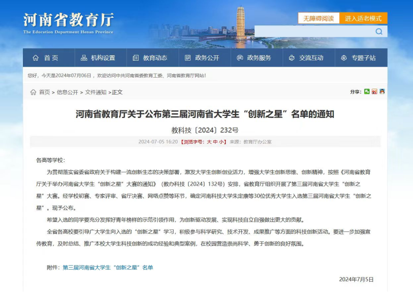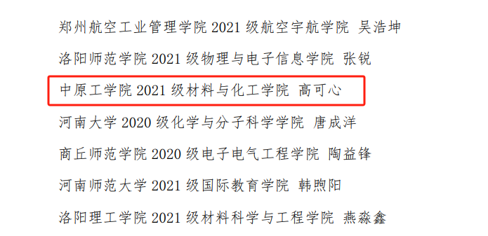 近日,河南省教育厅正式公布了第三届河南省老员工“创新之星”名单。经公司初赛、专家评审、省厅初赛、网络点赞等环节,公司2021级应用化学专业本科生高可心同学成功入选。