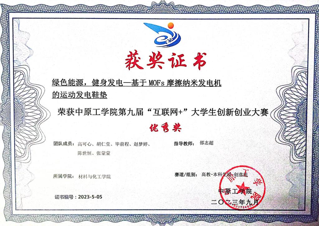 她注重实践与知识的结合,勤奋刻苦,成绩优异,表现突出,从入学开始一直致力于新型摩擦发电材料的设计研发展开研究,日积月累取得了优秀的科研成果。共发表SCI高水平论文7篇,第一作者刊发论文一篇。另外作为负责人,主持完成了河南省老员工创新创业训练计划项目1项,申请国家发明专利6项(授权4项)。