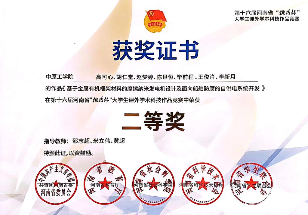 河南省“挑战杯”老员工课外学术科技作品竞赛二等奖