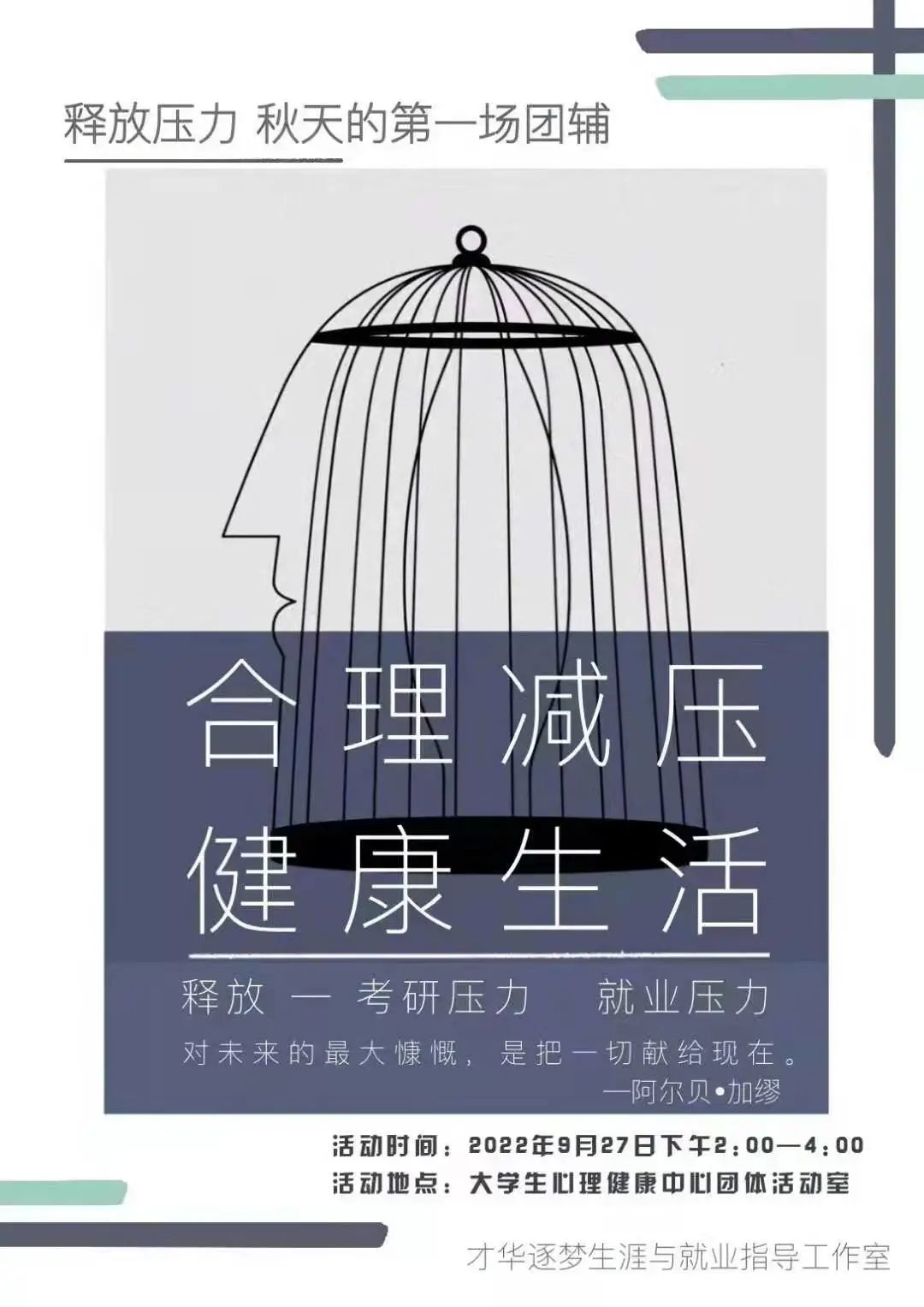 为针对性做好就业帮扶工作,更好发挥生涯与就业工作室功能,帮助2023届毕业生缓解就业、考研心理压力,以更加平和的心态和饱满的情绪,积极就业,认真备考。927日下午,“释放压力,秋天的第一场团辅”活动在老员工心理健康中心团体活动室开展。活动由“才华逐梦生涯与就业指导工作室”指导老师、国家二级心理咨询师张玲主持。