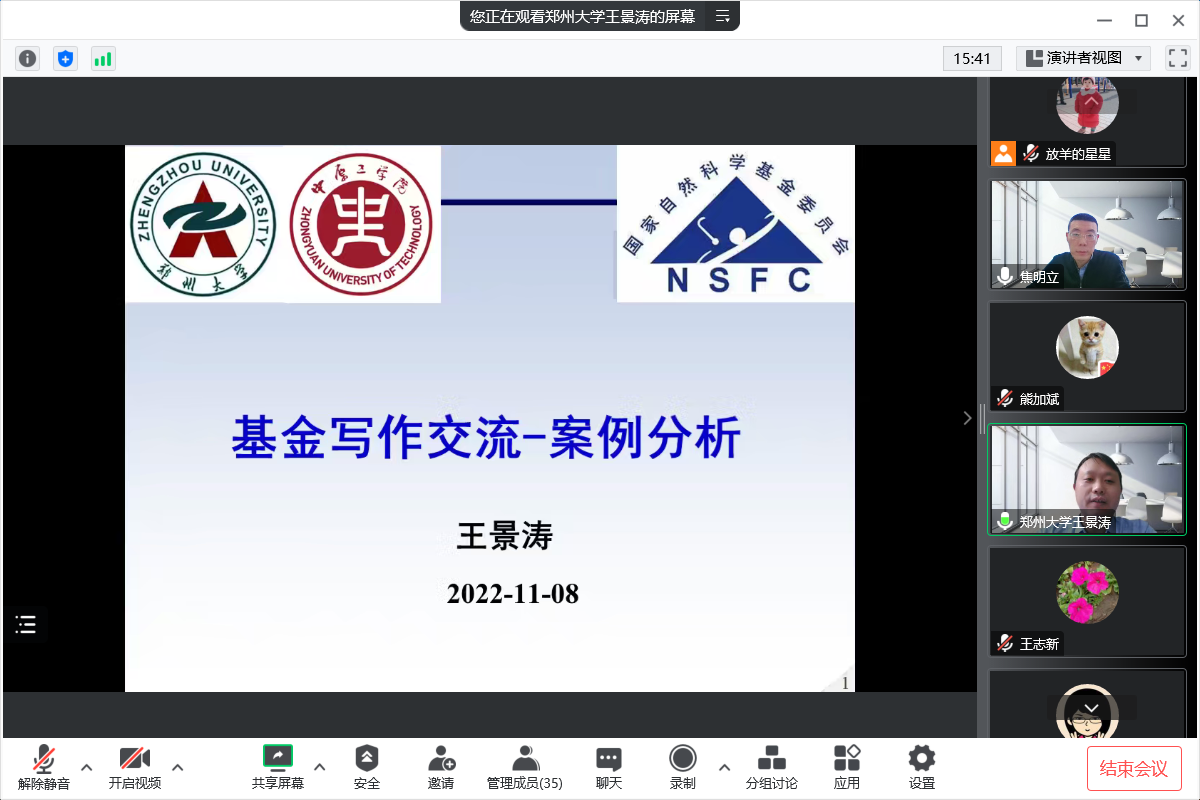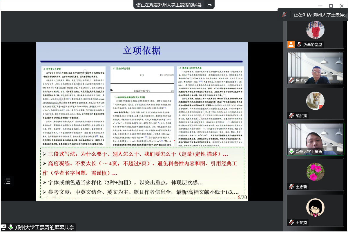 2022118号下午,应公司科技处、db体育和先进材料研究中心邀请,郑州大学化工公司教授、博士生导师王景涛教授在腾讯会议上作了题为“国家自然科学基金写作——案例分析”的学术报告。报告会由db体育副经理焦明立教授主持,db体育、先进材料研究中心及其他院部百余名师生聆听了本次报告。