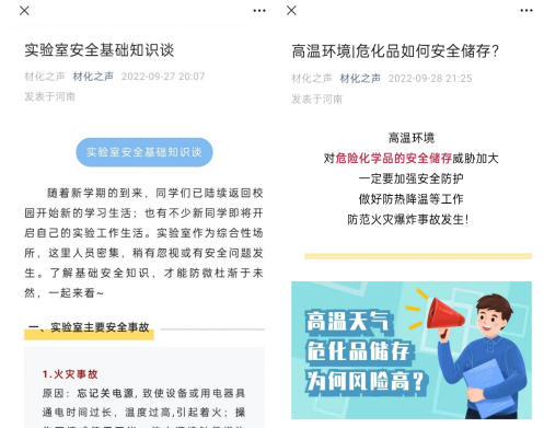 借助db体育认证公众号材化之声作为公司实验室安全宣传网上教育交流的主要平台,发布安全知识,利用员工喜闻乐见的方式让安全深入人心。