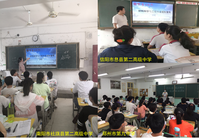 2020年6月,在全国新冠肺炎疫情防控有所缓和之际,公司材料科学与工程专业组织教师赴郑州市第九中学、南阳市社旗县第二高级中学和信阳市息县第二高级中学进行招生宣传。通过播放专业招生宣传PPT和口头宣传,向高三员工介绍了公司概况、公司概况、专业介绍、培养目标、毕业要求和奖助学金体系,并回答了部分员工关于招生政策和专业发展前景等问题。