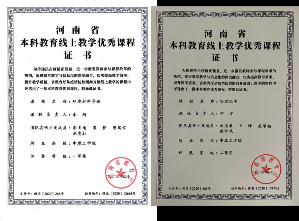 在2020年河南省教育厅公布的河南省本科教育线上教学优秀课程评选结果中,《环境材料导论》获得一等奖,《物理化学》获得二等奖。此外,《有机化学》和《铸造成型理论》被推荐为2020年省级线上线下混合式一流本科课程,《高聚物改性及功能高分子》和《物理化学》获得2020年度db体育官网入口线上线下混合式一流课程。《实验方法及数据处理》获得2021年度db体育官网入口线上一流课程。