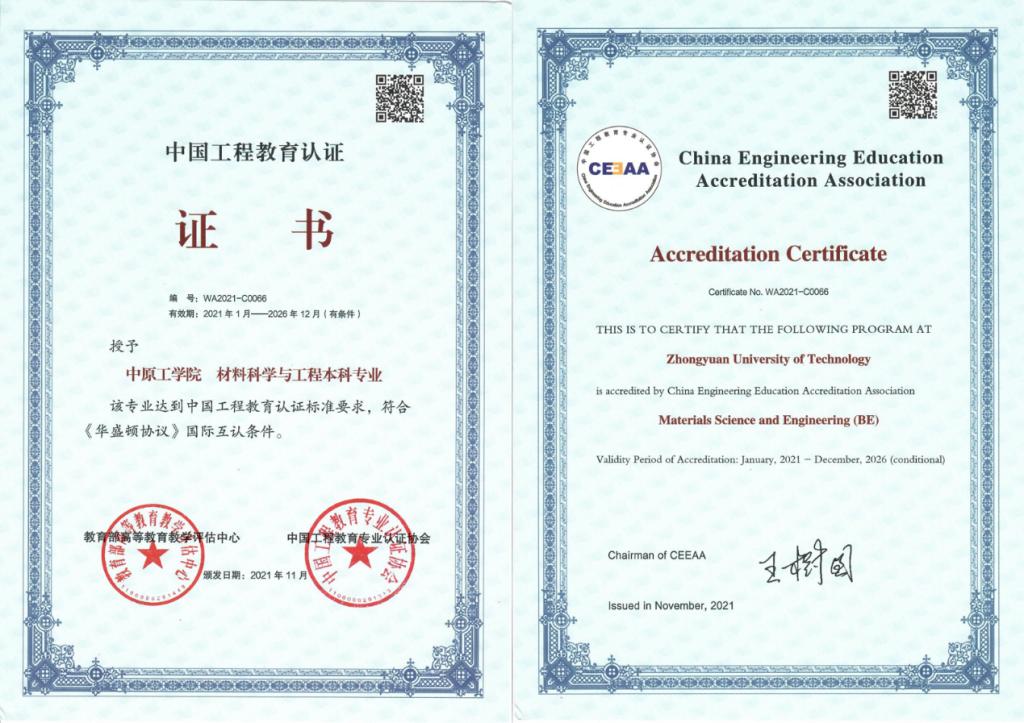 2020年,材料科学与工程专业被教育部批准为河南省一流本科专业建设点,同时被评为校级一流本科专业建设点。2021年材料科学与工程专业通过工程教育专业认证。2021年,高分子材料与工程与应用化学两个专业被评为校级一流本科专业建设点。