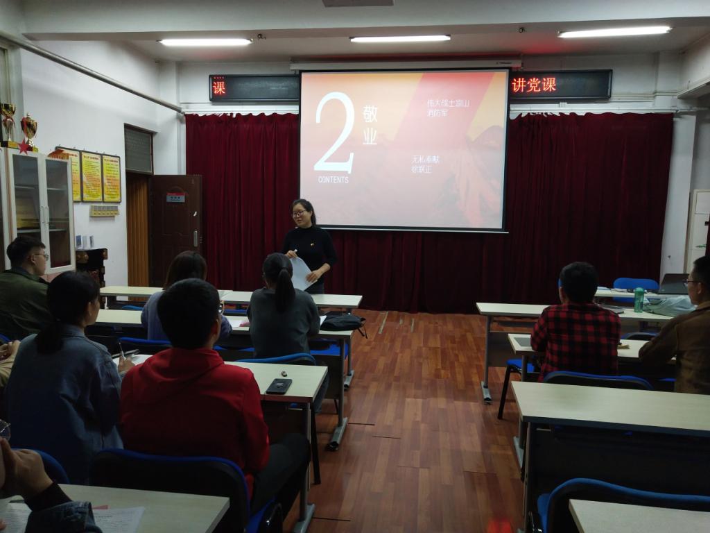 材料科学与工程员工党支部书记艾文英以“新中国成立70周年”为题,强调在奋进新时代的路上,一定要有攻坚克难的的决心和砥砺前行的勇气,做新时代的“筑梦者”和“奋斗者”。
