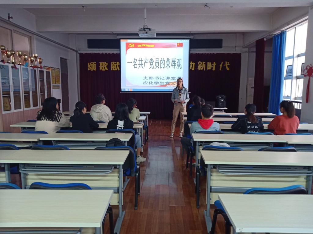 应用化学专业员工党支部书记洪潇以“一名共产党员的荣辱观”为本次教育专题,提醒支部成员要加强马克思主义基本理论修养、深入学习党章,树立自己的社会主义荣辱观。