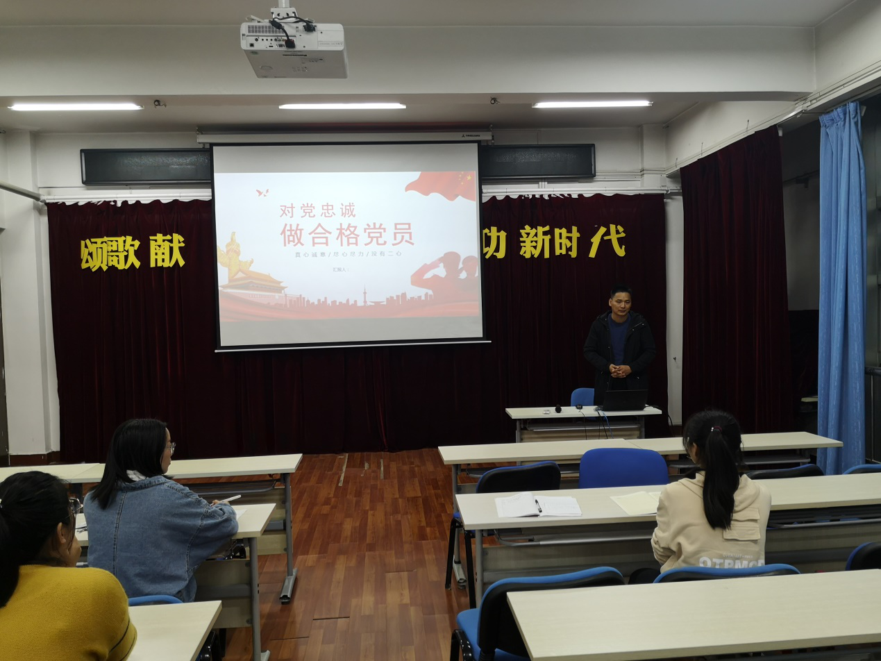 研究生员工党支部书记陈孔耀以“对党忠诚,做合格党员”为题,解释了对党忠诚的重要性,阐释了在对党忠诚方面,要自觉做到知行合一、彰显忠诚,为人民谋福利。